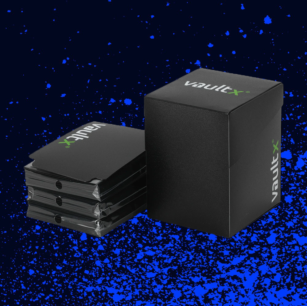 Large card deck box with 150 standard size black deck protector sleeves to fit a variety of standard sized cards. Made from archival-safe, acid-free non-PVC material the Vault X is the perfect way to store your cards. 12 Month Warranty from date of purchase.